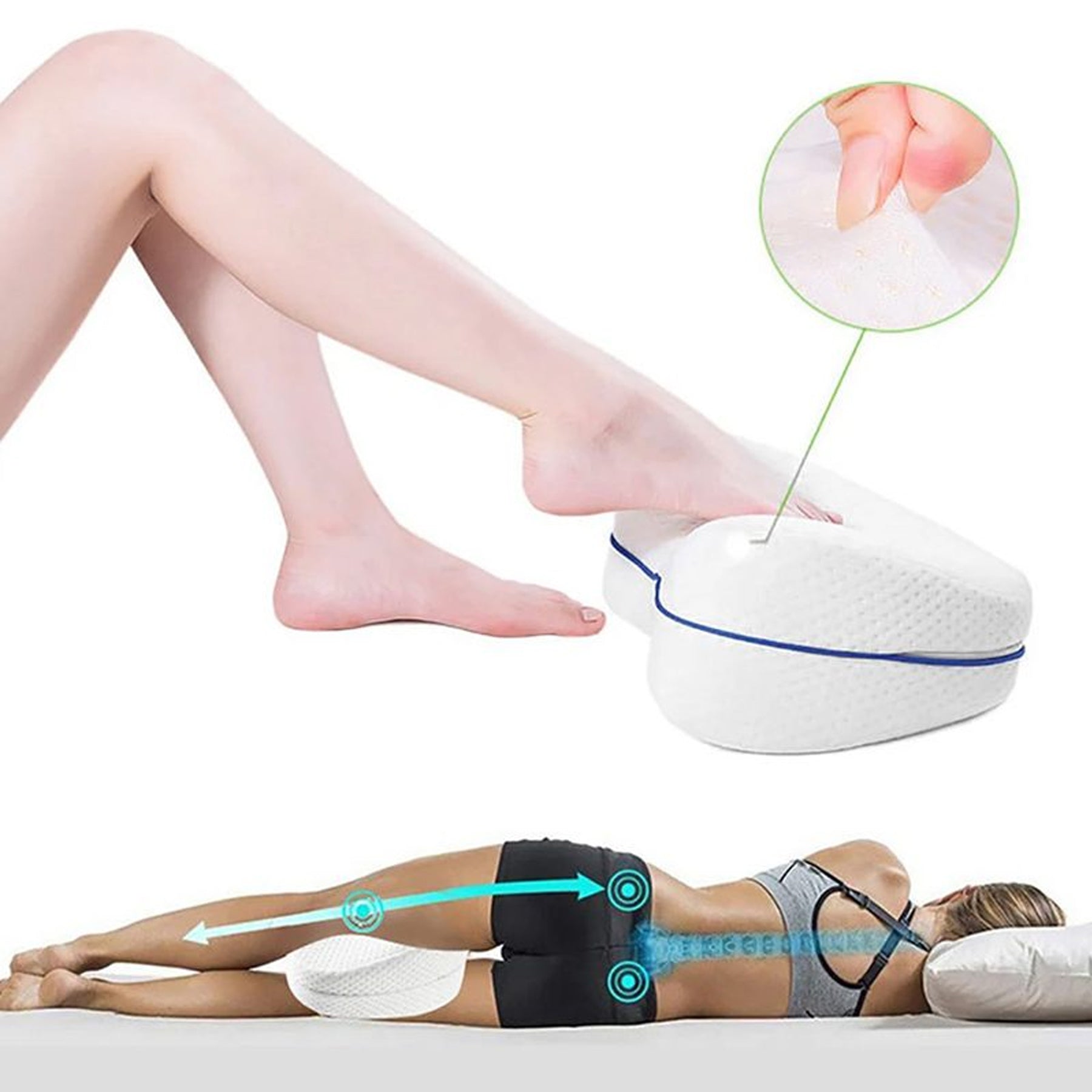 A forma anatômica impede a rotação da pelve, melhora a postura e promove relaxamento contínuo. Feito com material macio e agradável ao toque, o travesseiro conta com capa removível que facilita a limpeza e mantém a sensação de frescor mesmo após longos períodos de uso.