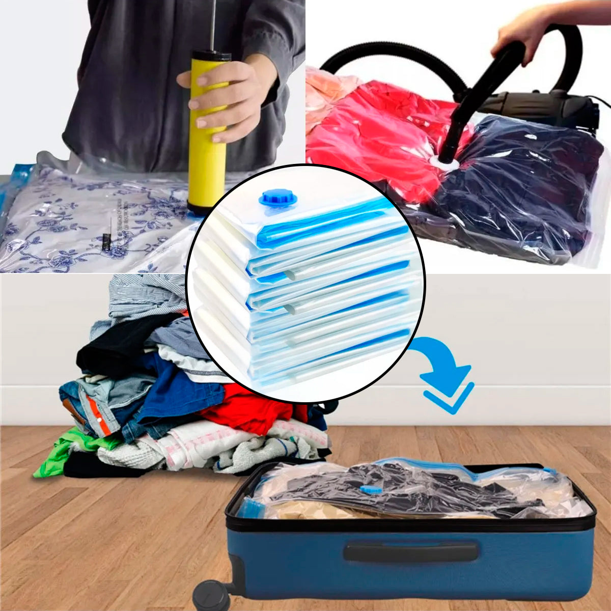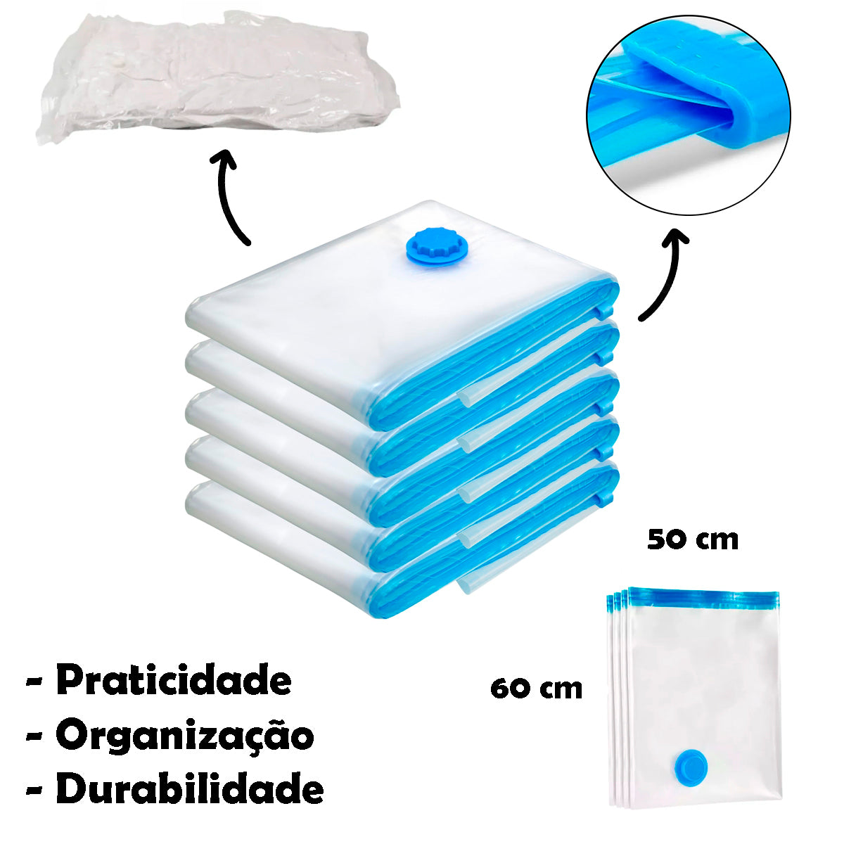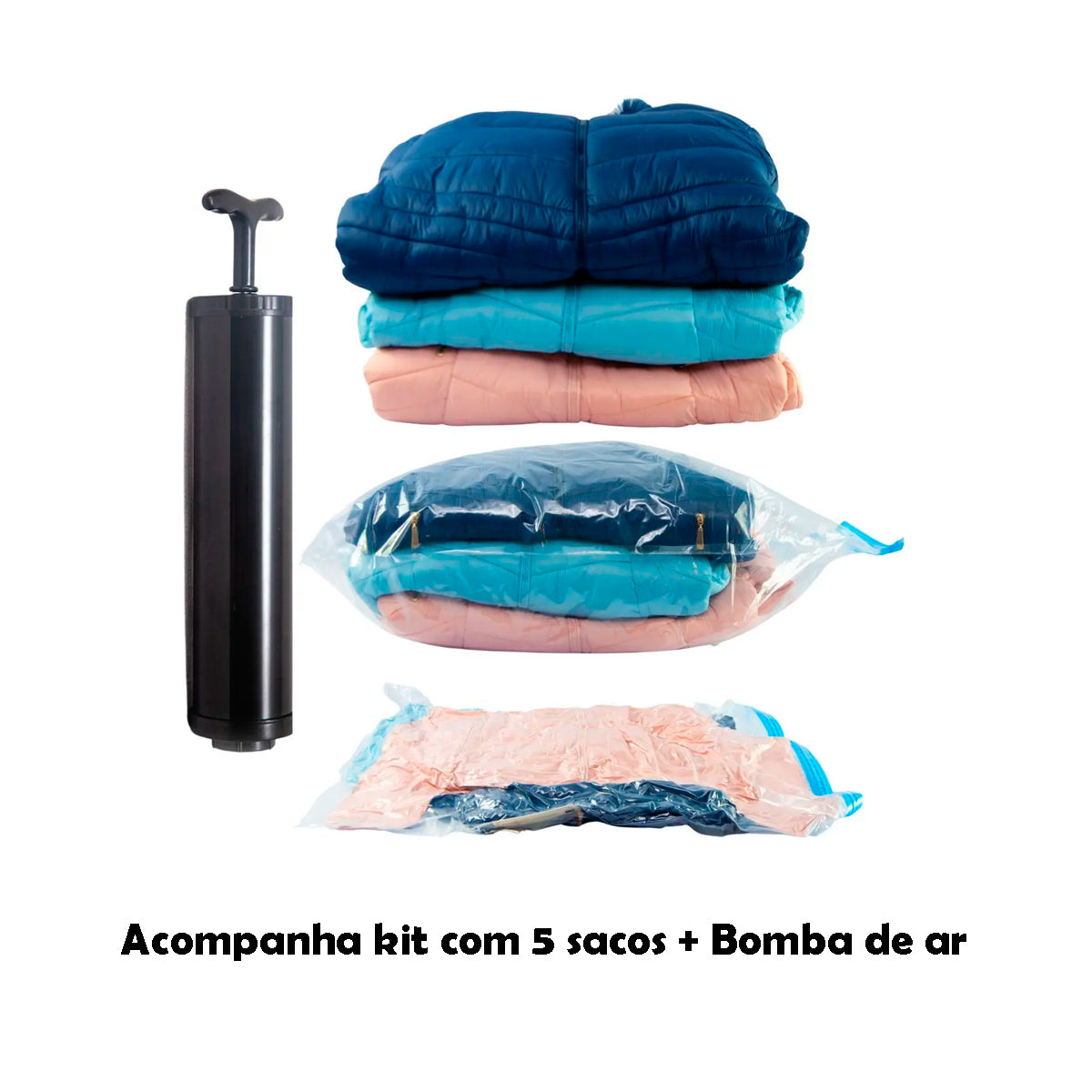 Não é necessário utilizar aspirador de pó. A bomba manual que acompanha o kit permite que qualquer pessoa faça a vedação em segundos, de maneira rápida e eficiente, inclusive durante viagens. Produzido com material resistente, reutilizável e com lacre hermético, o saco protege contra umidade, mofo e cheiro de guardado, sendo perfeito para quem possui pouco espaço ou precisa manter a mala sempre organizada.